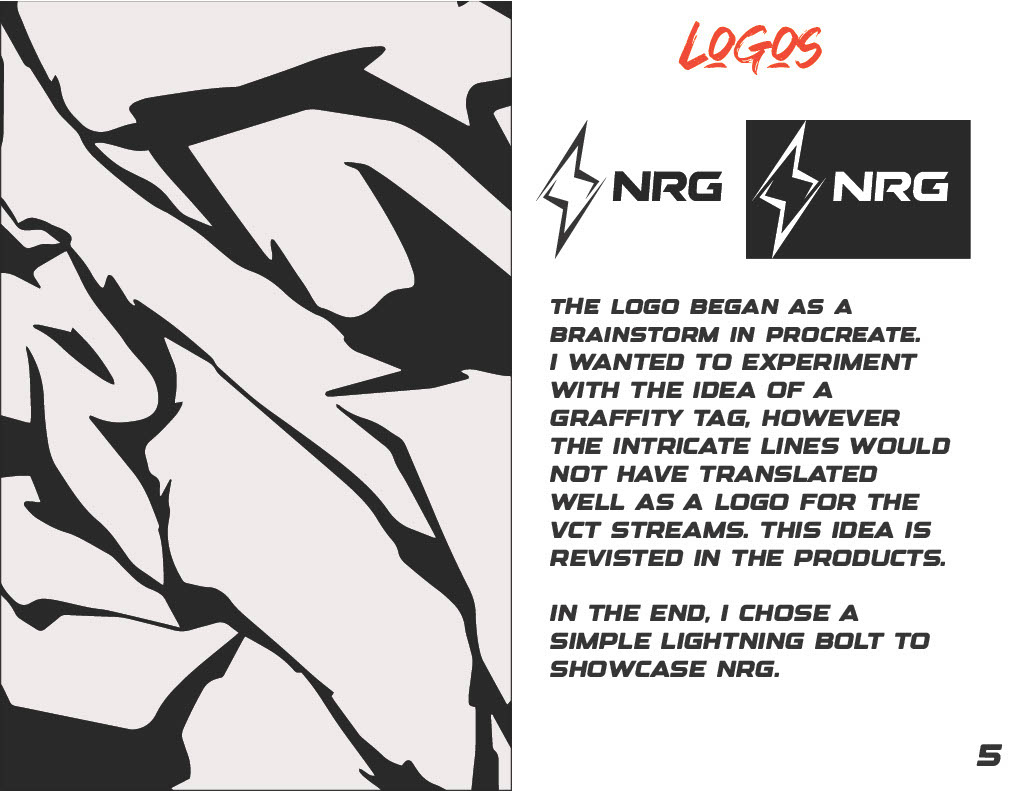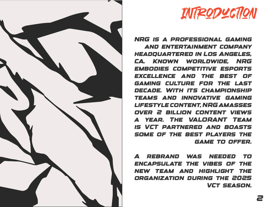 I wanted to rebrand one of my favorite eSports teams for a school project. NRG as a company has several teams for different video games. I chose to rebrand their pro Valorant team.